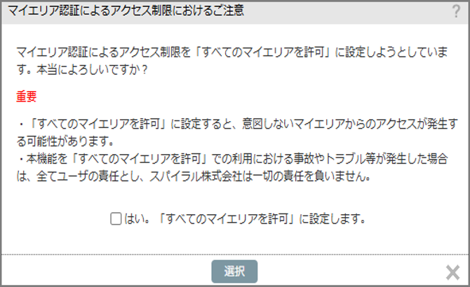 ▼「【非推奨】すべてのマイエリアを許可」を選択時の注意モーダル