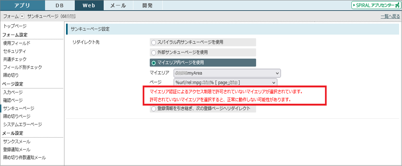 ▼フォーム「サンキューページ」のリダイレクト先で指定したマイエリアが「選択したマイエリアを許可」に入っていない場合の注意文言