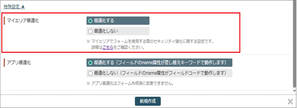 フォームを新規作成する際、「特殊設定」を表示すると「マイエリア最適化」が表示され、
