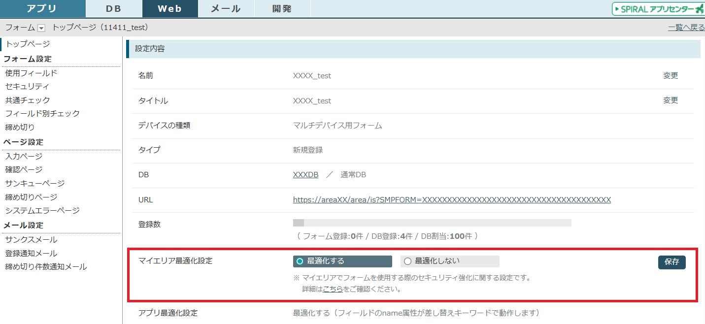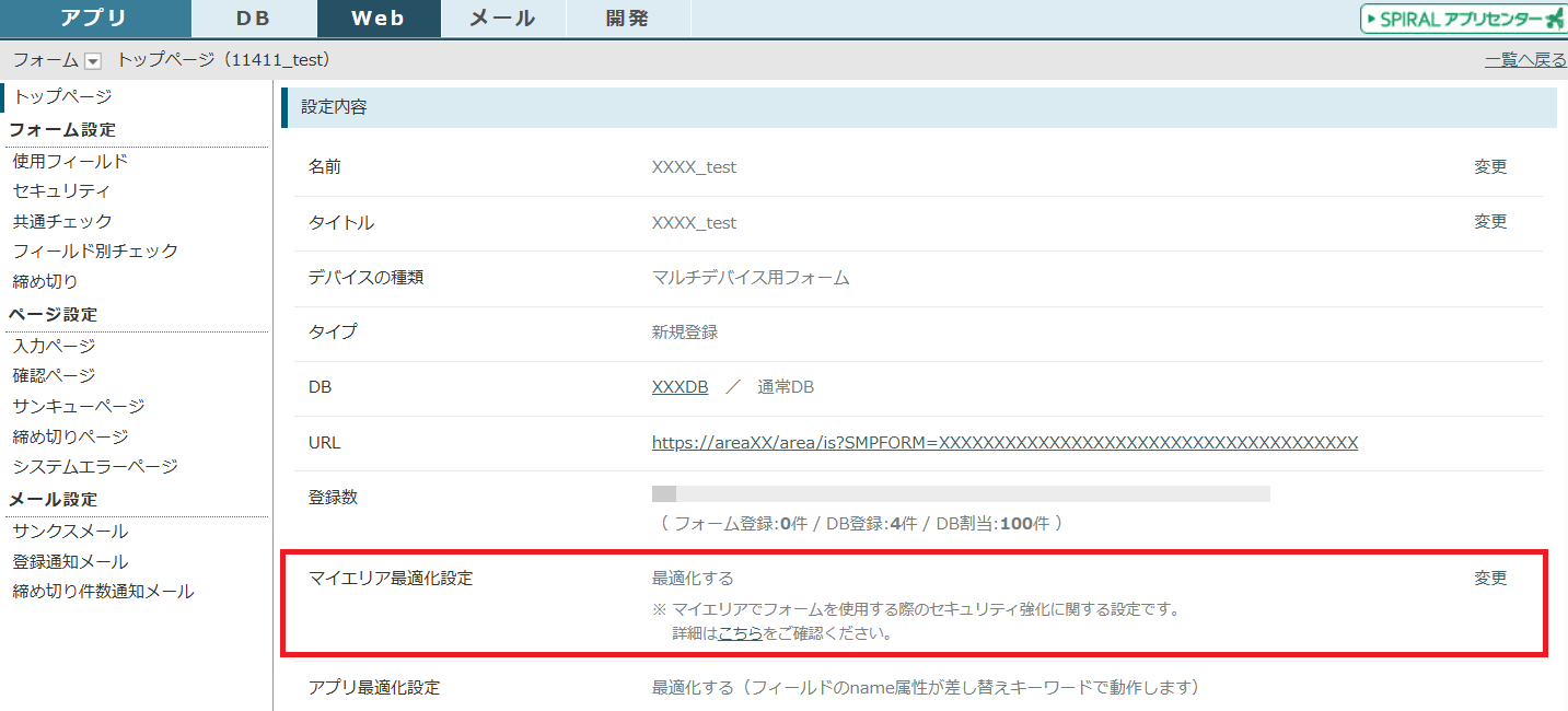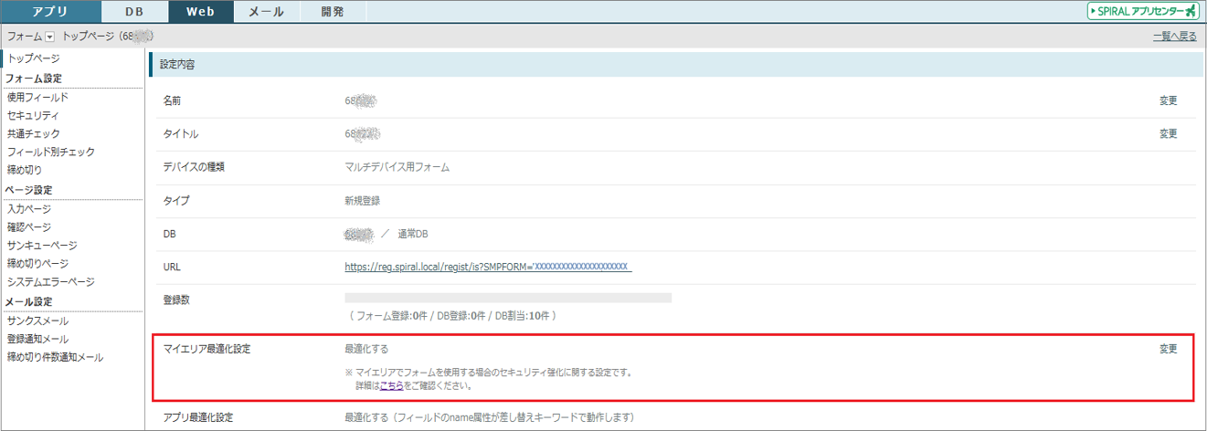 ・作成したフォームのトップページでは、「マイエリア最適化設定」項目が新たに追加され、「変更」ボタンから設定を切り替えることができます。
