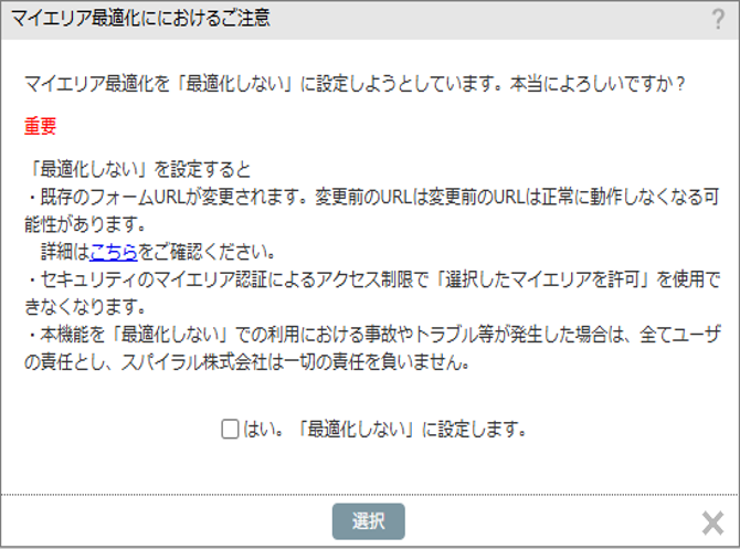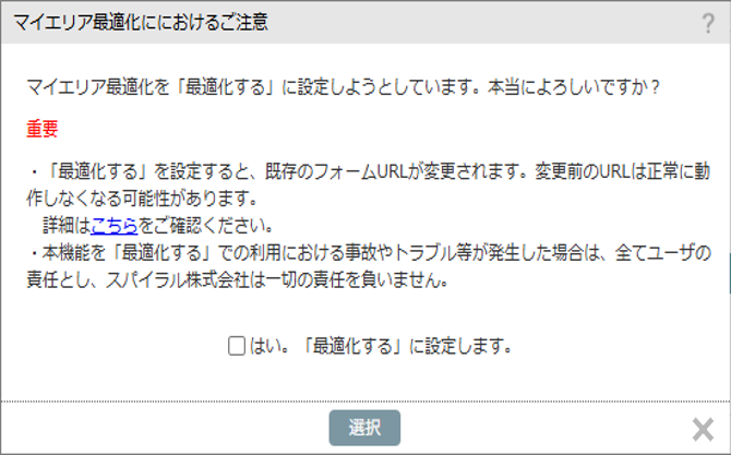 ※フォーム「マイエリア認証によるアクセス制限」を制限して「選択したマイエリアを許可」に設定する場合、最適化するを選択してください。