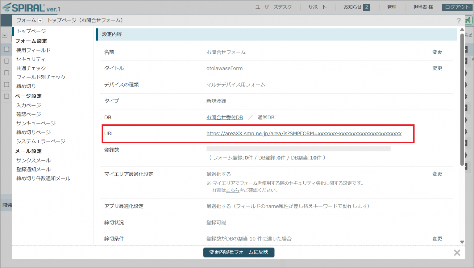 フォーム作成後のトップページに記載されているURLから実際に稼働するかの確認をします。