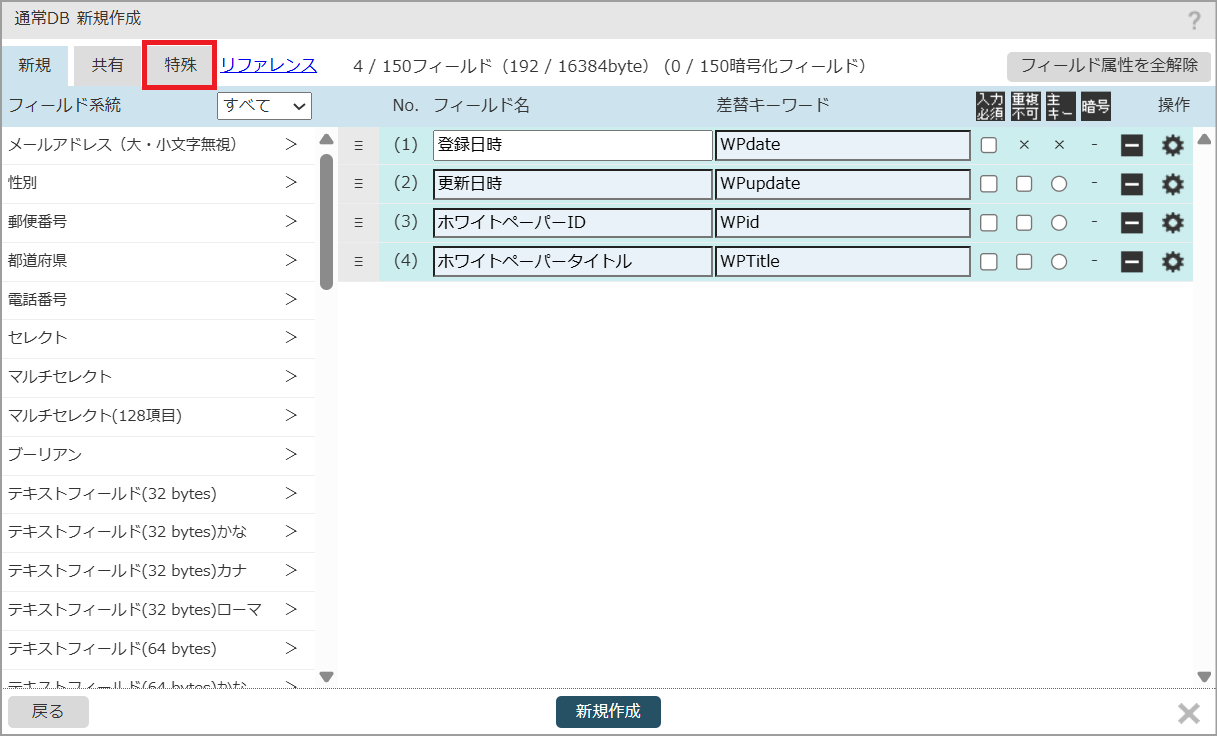 1.DBのフィールド構成画面の「特殊」