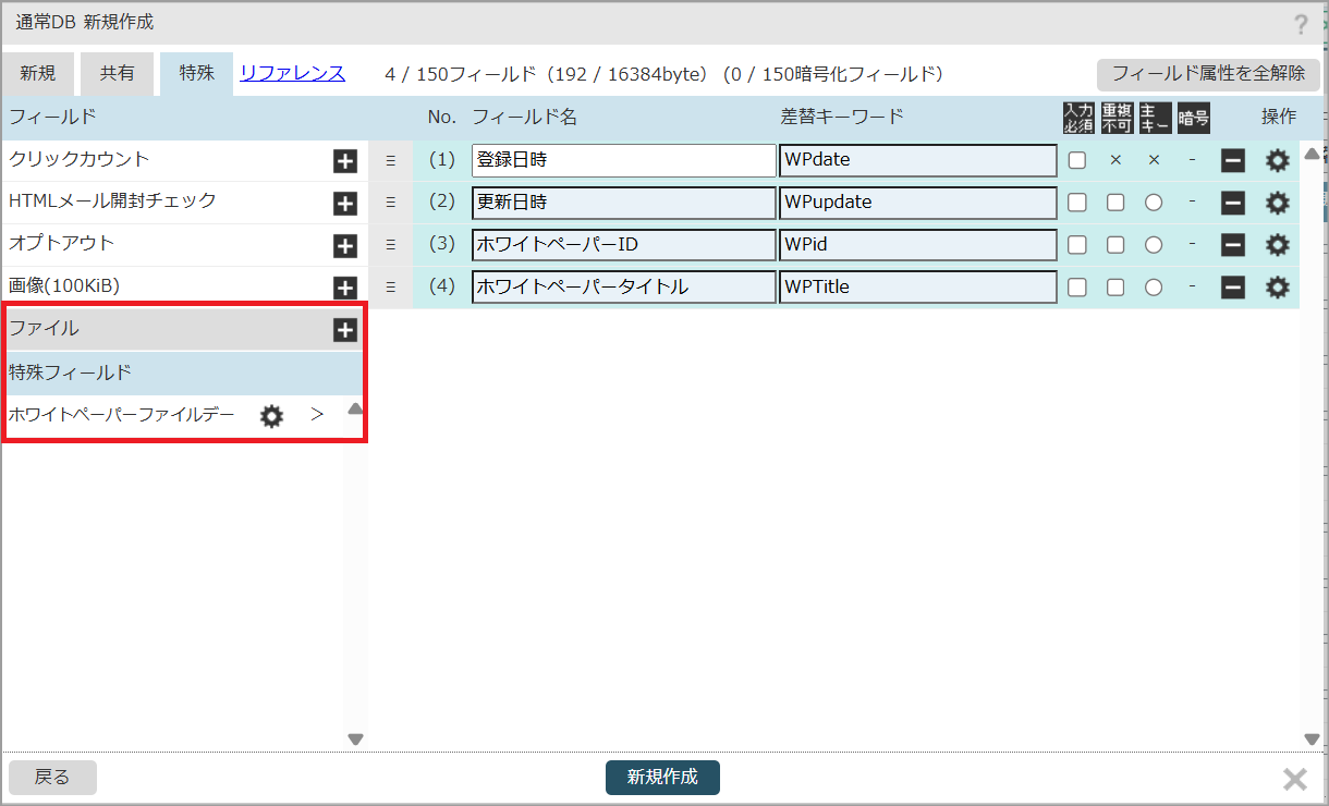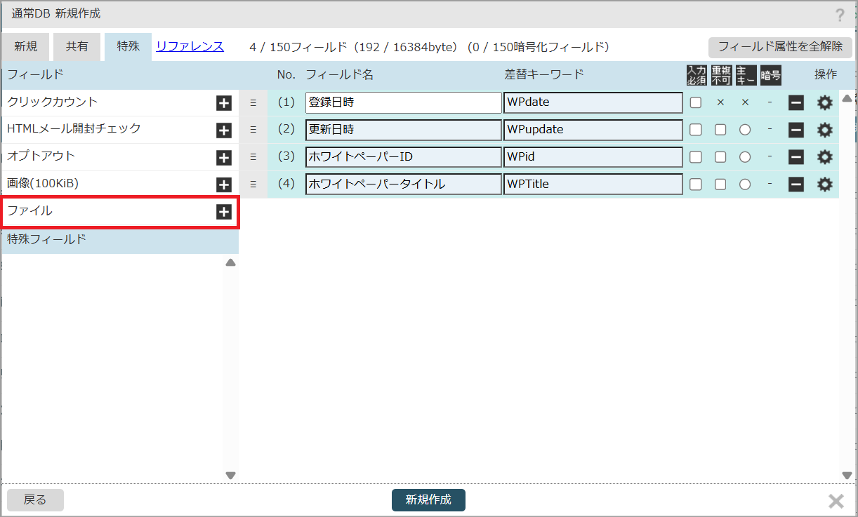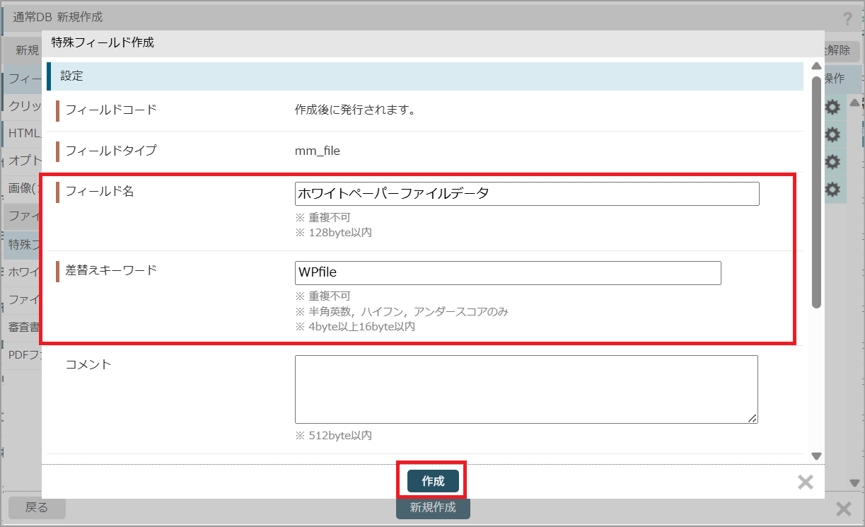 3.「特殊フィールド作成」の画面で「フィールド名」「差替えキーワード」を入力し、「作成」をクリックします。