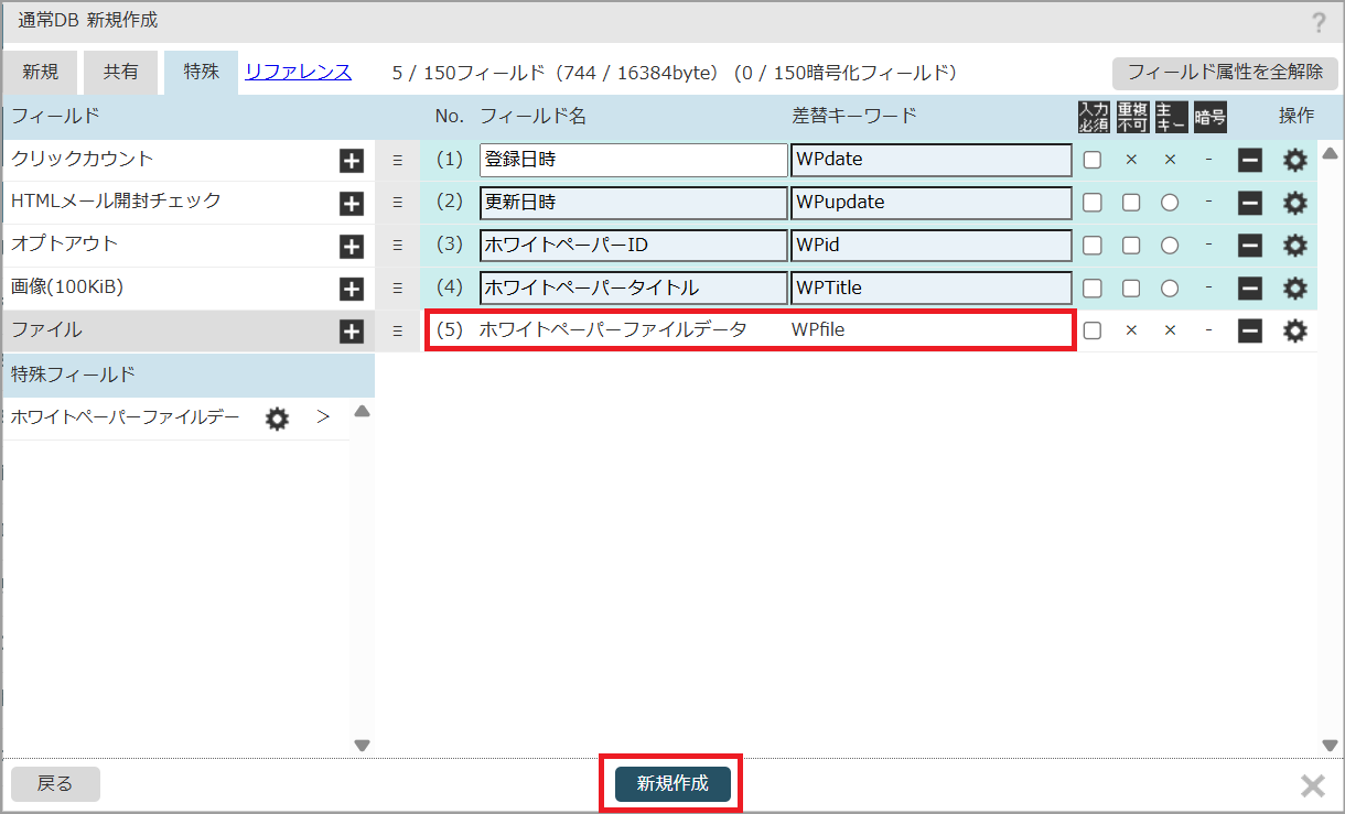 ホワイトペーパーのファイルデータをを格納するためのフィールドを作成します。